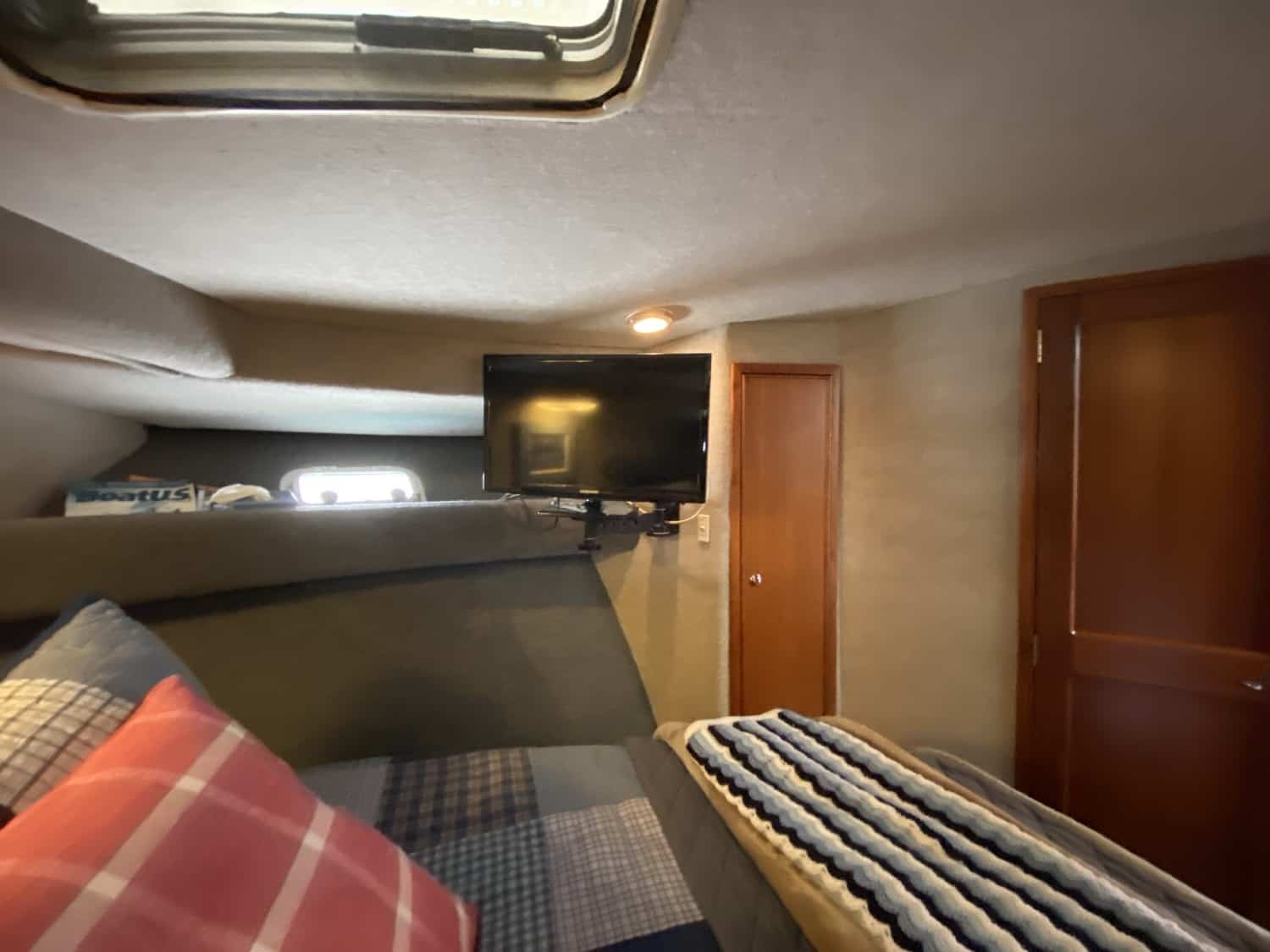 Custom mattress in master stateroom, including custom fitted pad and sheets